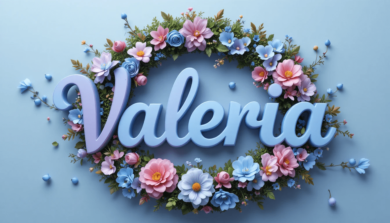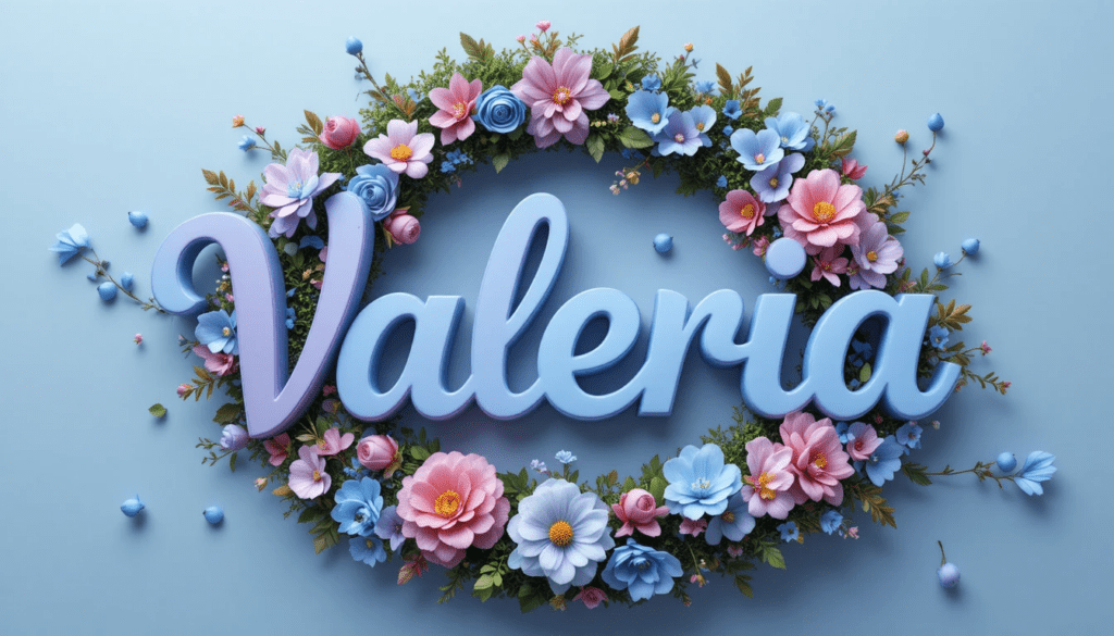 Nombre “Valeria” en letras 3D estilo arcilla suave y volumétrica, colores pastel azul, rosa y lila, borde oscuro resaltado, marco circular tipo corona cubierta de musgo verde, flores grandes en tonos pastel azul, rosa y durazno, hojas decorativas suaves, pequeñas luces cálidas alrededor, iluminación dorada suave tipo atardecer, fondo minimalista claro.