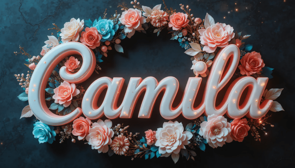 Nombre “Camila” en tipografía 3D redondeada tipo plastilina elegante, colores pastel vibrantes, contorno oscuro grueso, corona circular natural con textura de musgo, flores delicadas en tonos celeste, rosa y coral, pequeñas luces decorativas brillando, iluminación cálida cinematográfica.