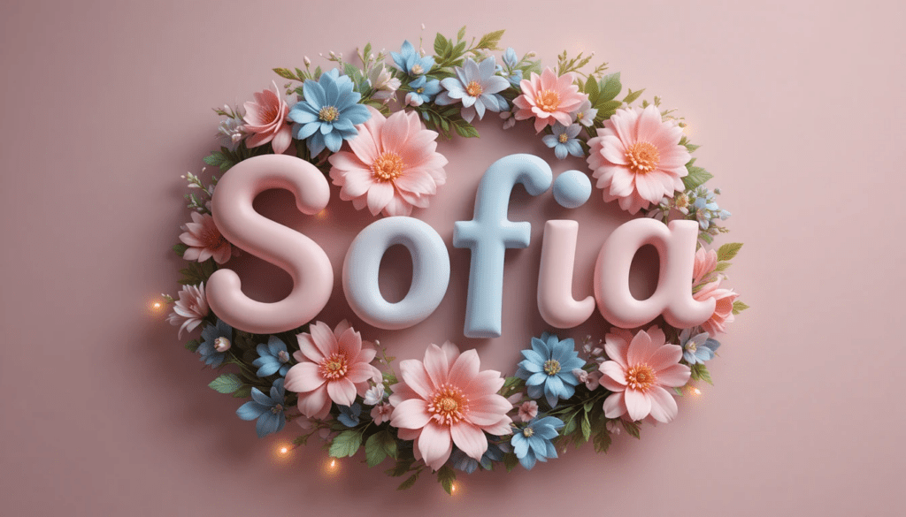 Nombre “Sofía” en letras 3D estilo goma suave multicolor pastel, marco circular verde musgo con flores grandes en tonos azul cielo y rosa claro, hojas decorativas detalladas, pequeñas luces doradas brillando alrededor, fondo neutro elegante.