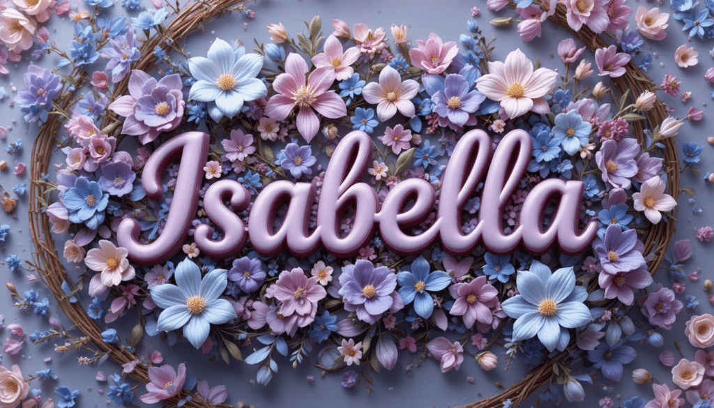 Nombre “Isabella” en tipografía 3D estilo arcilla moldeada, colores suaves pastel con efecto sombra, marco circular natural cubierto de musgo, flores delicadas en tonos lila, durazno y celeste, iluminación cálida suave tipo estudio.
