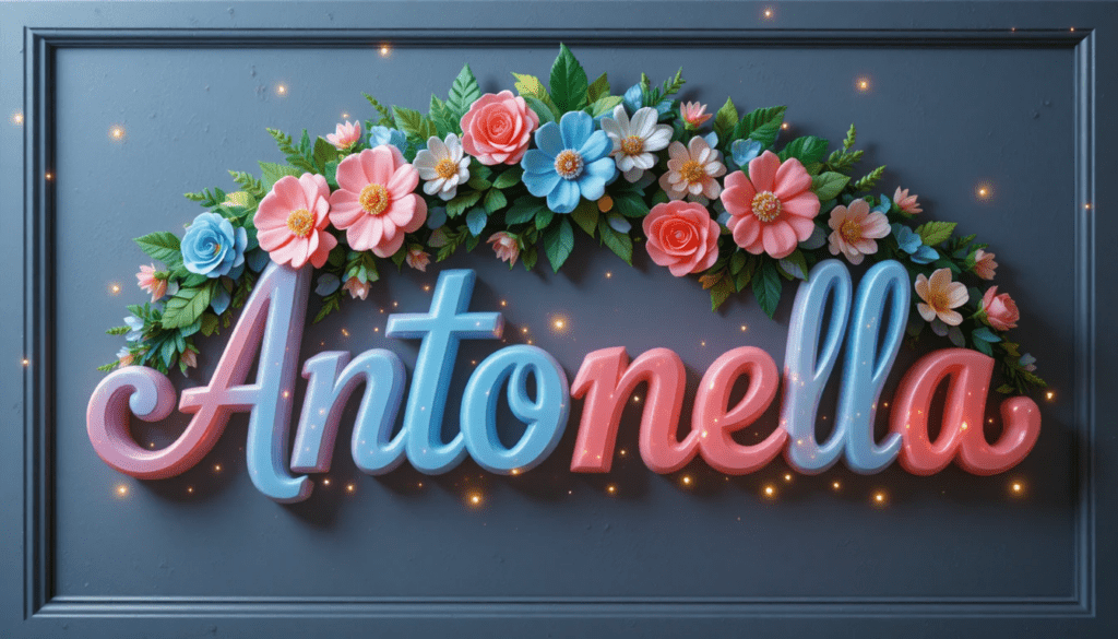 Nombre “Antonella” en letras 3D volumétricas tipo plastilina, colores pastel rosa, azul y coral, borde oscuro elegante, corona circular verde con flores grandes decorativas y hojas suaves, pequeñas luces brillando alrededor.