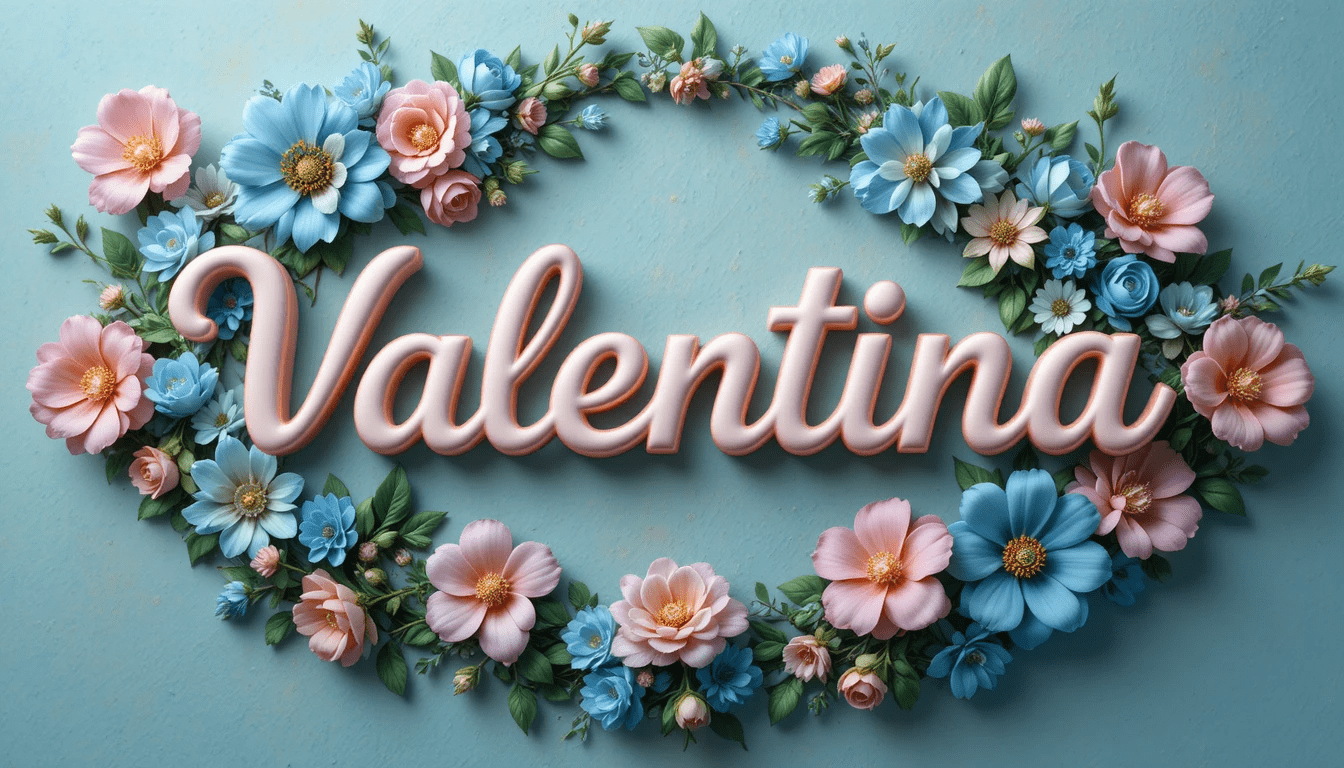 Nombre “Valentina” en tipografía 3D suave estilo goma brillante, colores pastel armoniosos, marco circular con textura natural musgo verde, flores grandes en tonos azul, rosa y durazno, iluminación cálida romántica.