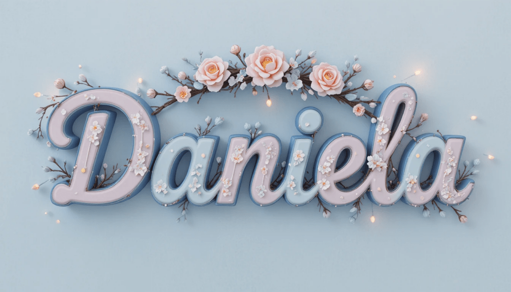 Nombre “Daniela” en letras 3D redondeadas estilo arcilla, combinación pastel azul y rosa con contorno oscuro, corona circular natural decorada con flores delicadas, pequeñas luces doradas alrededor, fondo minimalista claro.
