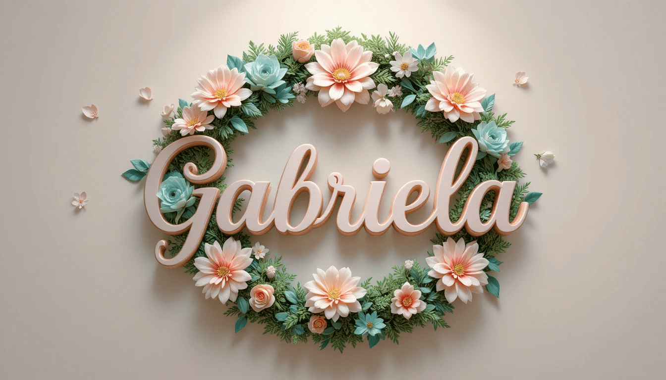 Nombre “Gabriela” en tipografía 3D estilo plastilina elegante, colores pastel suaves, marco circular verde musgo con flores grandes decorativas en tonos celeste y rosa, iluminación suave y cálida.