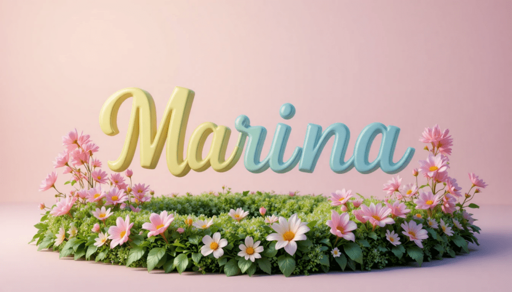 Nombre “Marina” en tipografía 3D moldeada tipo arcilla, tonos pastel vibrantes, marco circular verde natural con flores delicadas, iluminación cálida tipo atardecer, render 4K hiperrealista.