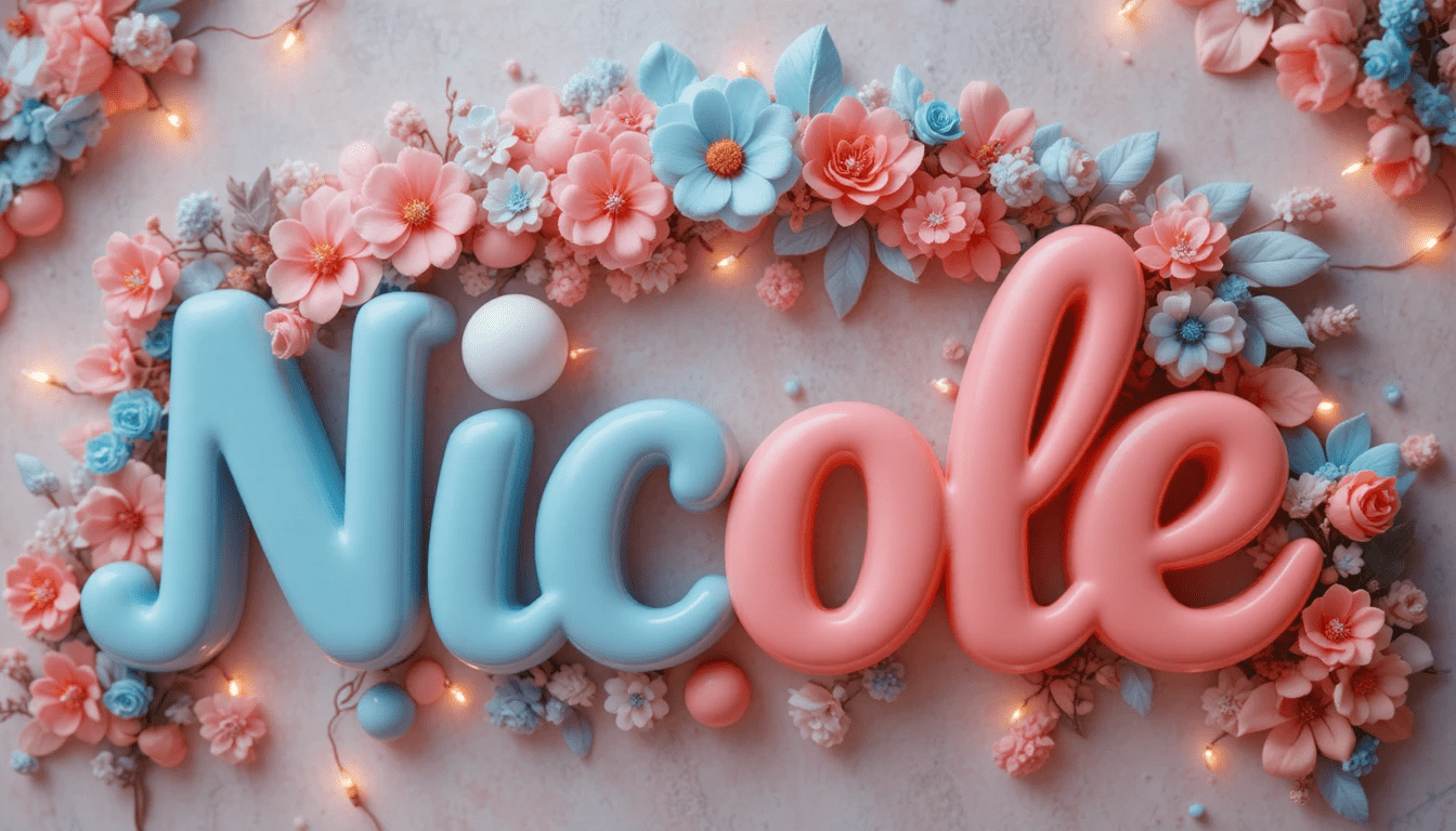 Nombre “Nicole” en letras 3D redondeadas estilo goma suave, colores pastel azul y coral, corona circular con textura musgo y flores suaves decorativas, pequeñas luces cálidas alrededor.