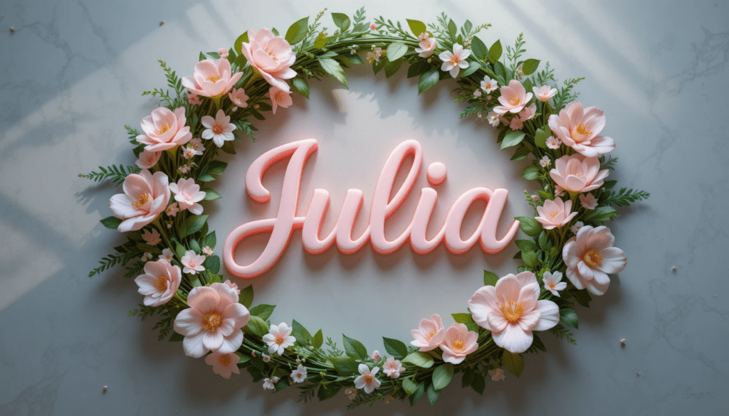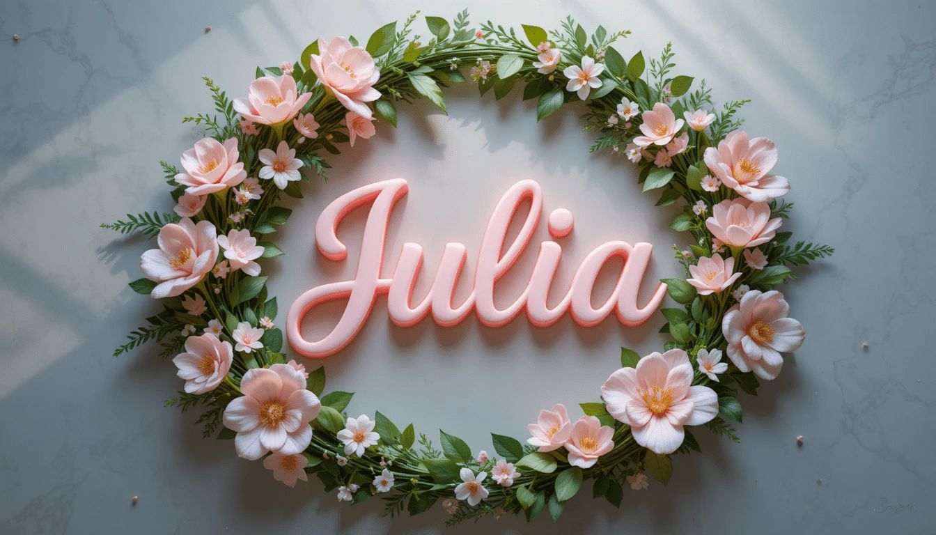 Nombre “Julia” en tipografía 3D elegante estilo plastilina, colores pastel suaves, marco circular verde natural con flores grandes y hojas decorativas, iluminación romántica.