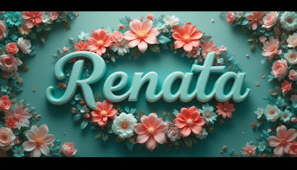 Nombre “Renata” en tipografía 3D estilo arcilla moldeada, colores pastel armoniosos, marco circular verde con flores delicadas en tonos coral y celeste, iluminación suave cinematográfica.
