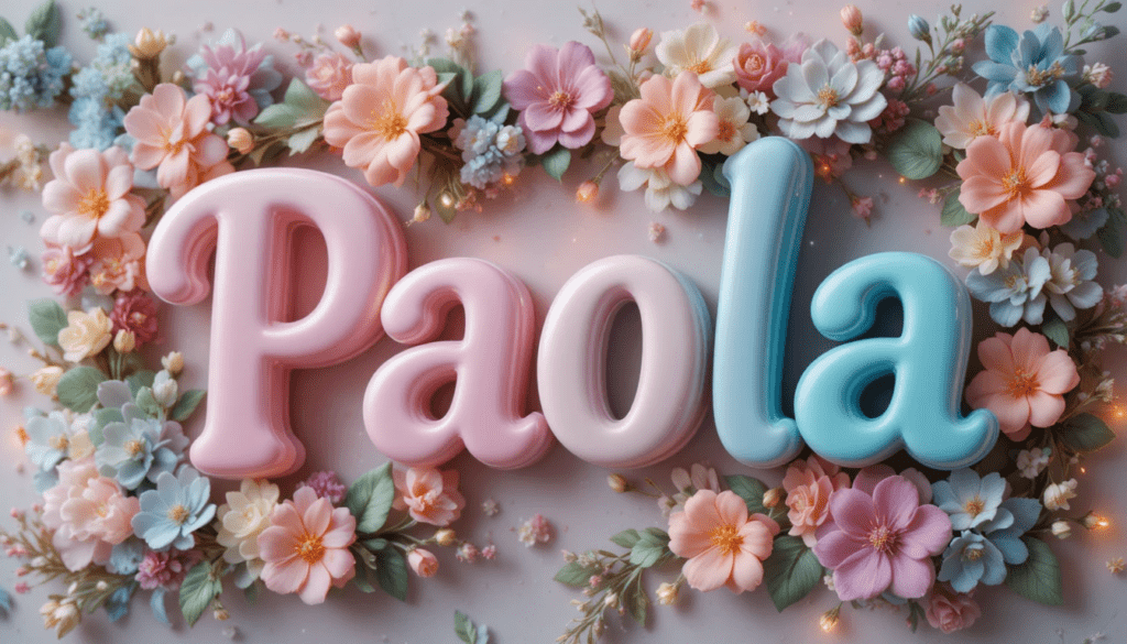 Nombre “Paola” en letras 3D suaves estilo goma brillante, colores pastel vibrantes, corona circular natural con textura de musgo, flores grandes decorativas y pequeñas luces cálidas.
