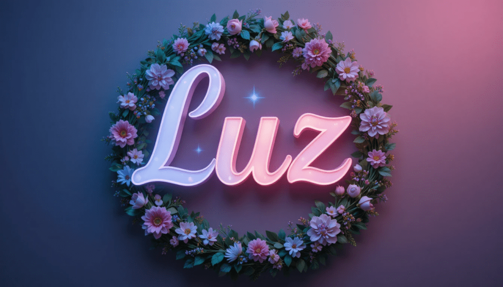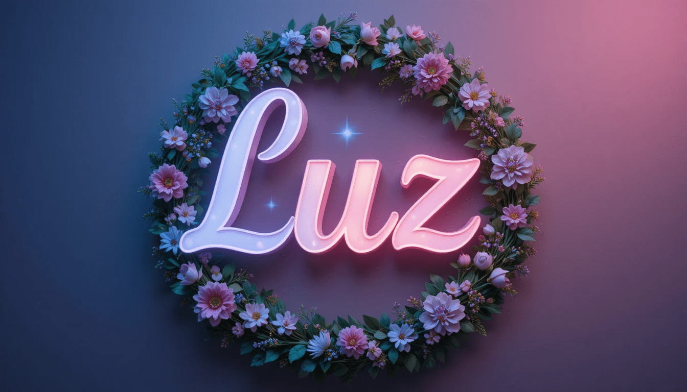 Nombre “Luz” en tipografía 3D redondeada elegante, tonos pastel azul, rosa y lila, marco circular verde natural con flores decorativas, iluminación cálida suave.