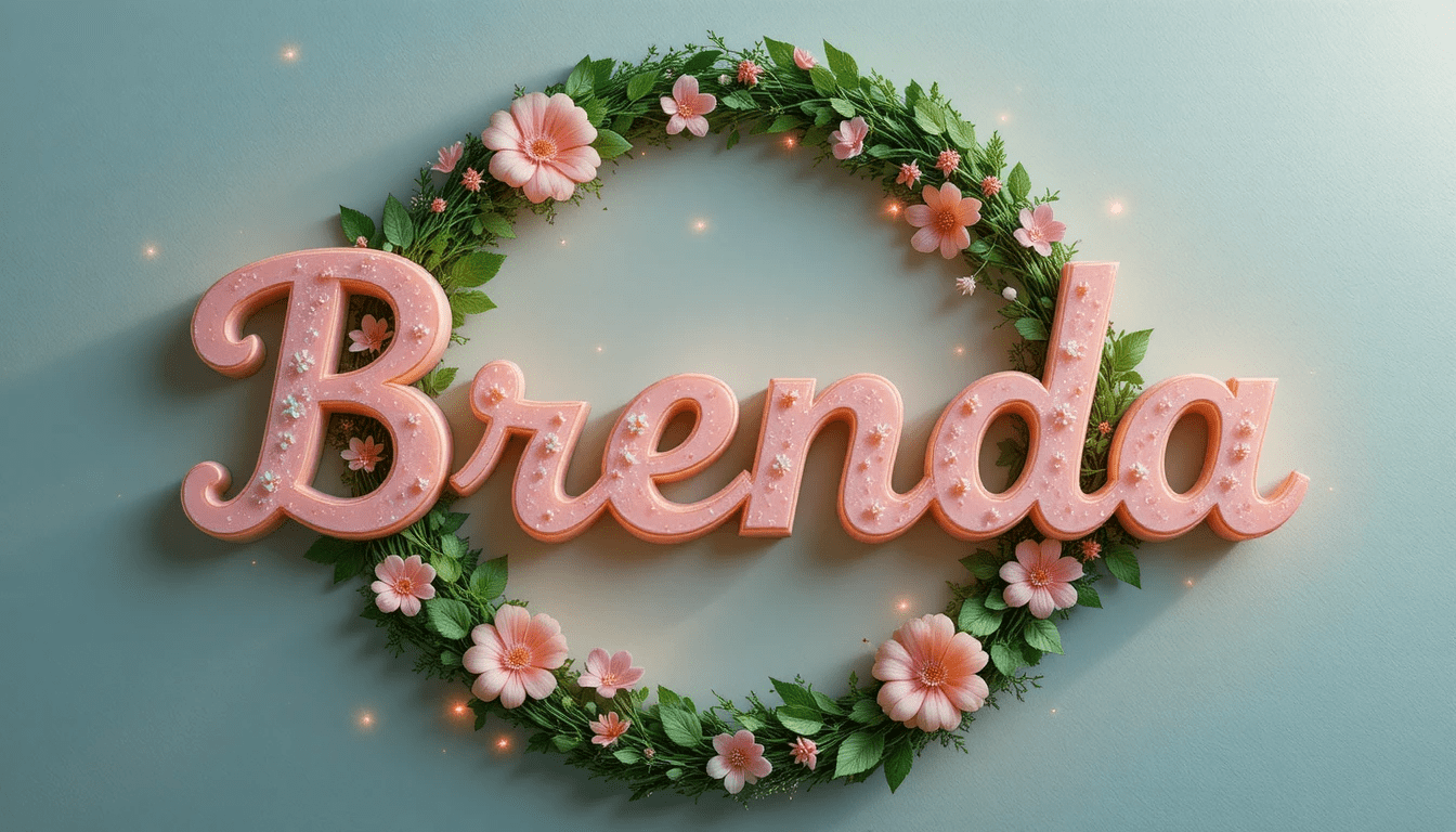 Nombre “Brenda” en tipografía 3D moldeada estilo arcilla, tonos pastel armoniosos, marco circular verde musgo con flores delicadas, iluminación cálida romántica.