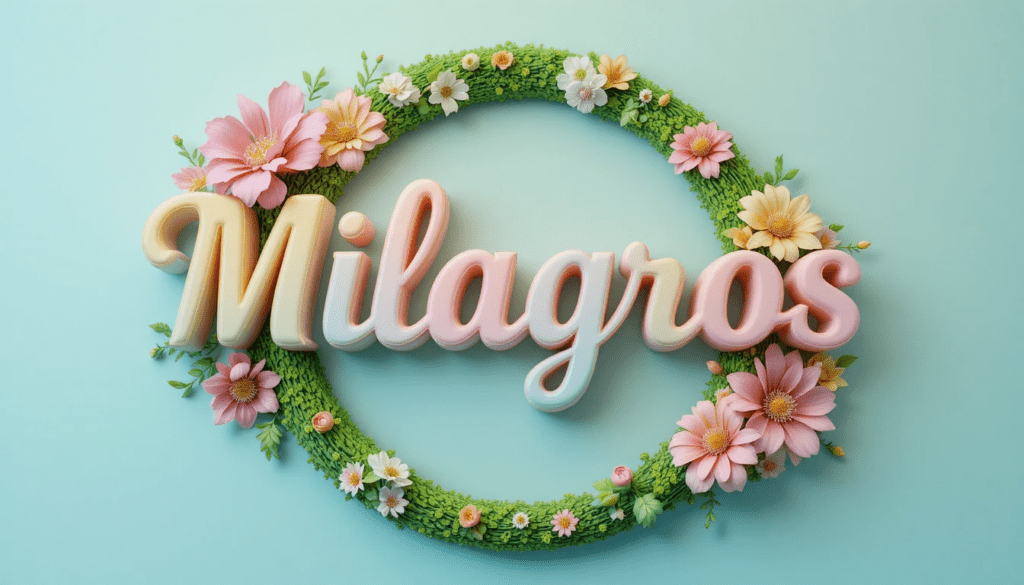 Nombre “Milagros” en tipografía 3D estilo goma volumétrica, colores pastel vibrantes, marco circular cubierto de musgo verde, flores decorativas grandes en tonos pastel, iluminación dorada suave, render ultra detallado 4K.