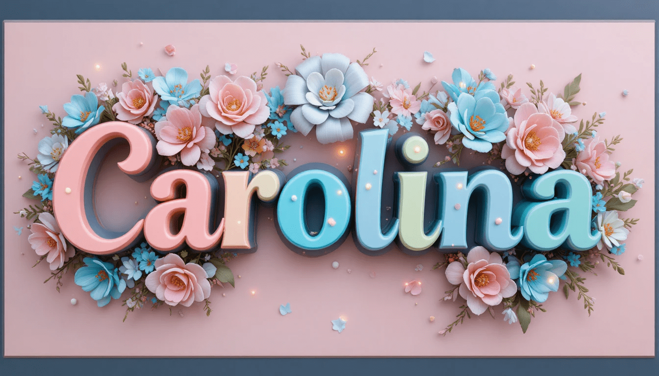 Nombre “Carolina” en letras 3D suaves multicolor pastel, borde oscuro resaltado, corona circular natural con flores grandes en tonos celeste y rosa, pequeñas luces brillando.